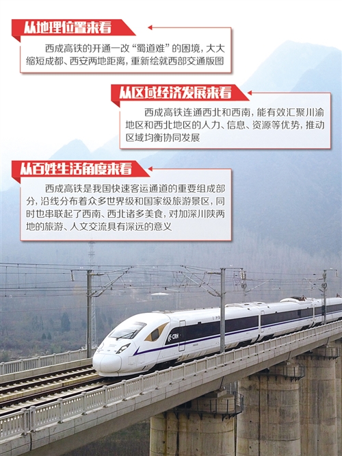 從地理位置來(lái)看,西成高鐵將一改“蜀道難”的困境,大大縮短成都、西安兩地距離,重新繪就西部交通版圖。從區(qū)域經(jīng)濟(jì)發(fā)展來(lái)看,西成高鐵連通西北和西南,能有效匯聚川渝地區(qū)和西北地區(qū)的人力、信息、資源等優(yōu)勢(shì),推動(dòng)區(qū)域均衡協(xié)同發(fā)展。從百姓生活角度來(lái)看,西成高鐵是我國(guó)快速客運(yùn)通道的重要組成部分,沿線分布著眾多世界級(jí)和國(guó)家級(jí)旅游景區(qū),對(duì)加深川陜兩地的旅游、人文交流具有深遠(yuǎn)的意義。