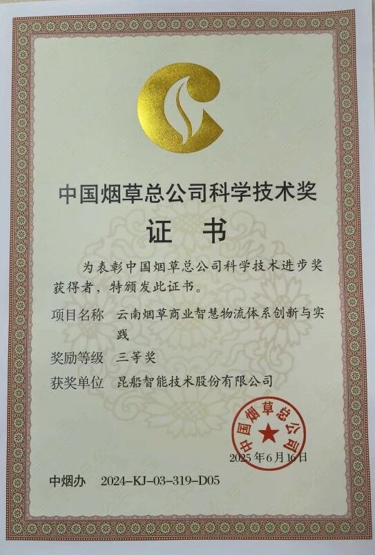 近日,中船集團(tuán)旗下昆船公司所屬昆船智能協(xié)同相關(guān)單位及高校申報(bào)的“云南煙草商業(yè)智慧物流體系創(chuàng)新與實(shí)踐”項(xiàng)目成果獲得中國煙草總公司科技進(jìn)步獎(jiǎng)三等獎(jiǎng)。