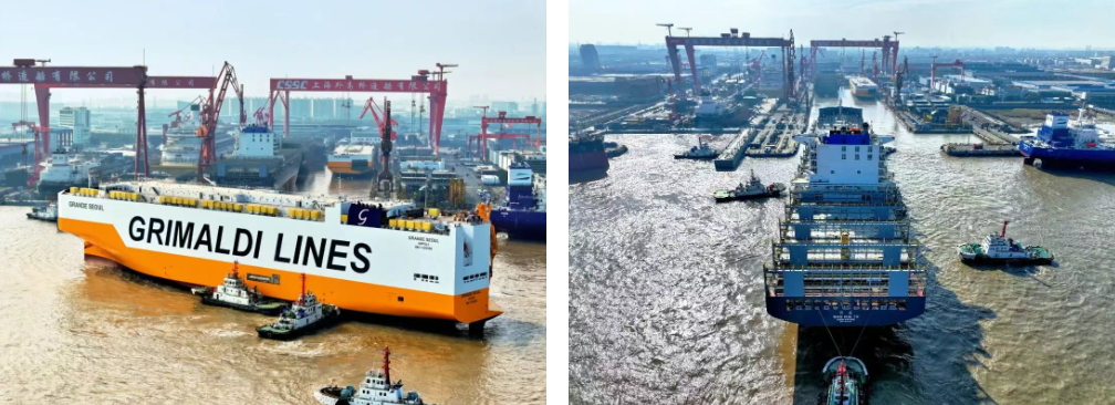 12月16日,中國船舶集團有限公司旗下外高橋造船建造的9000車汽車運輸船H1608和7000TEU集裝箱船H1353從一號船塢出塢。至此,外高橋造船實現了一號船塢、二號船塢年度各八批次、共計24艘船舶的出塢任務,在超額完成年度交船目標的基礎上,以領跑姿態圓滿完成“十四五”收官,順利開啟“十五五”新征程。