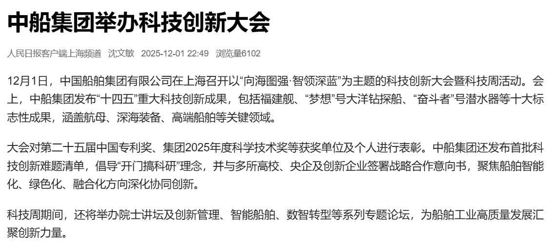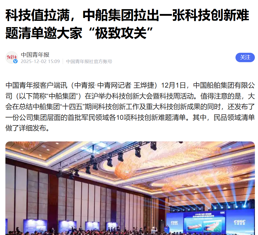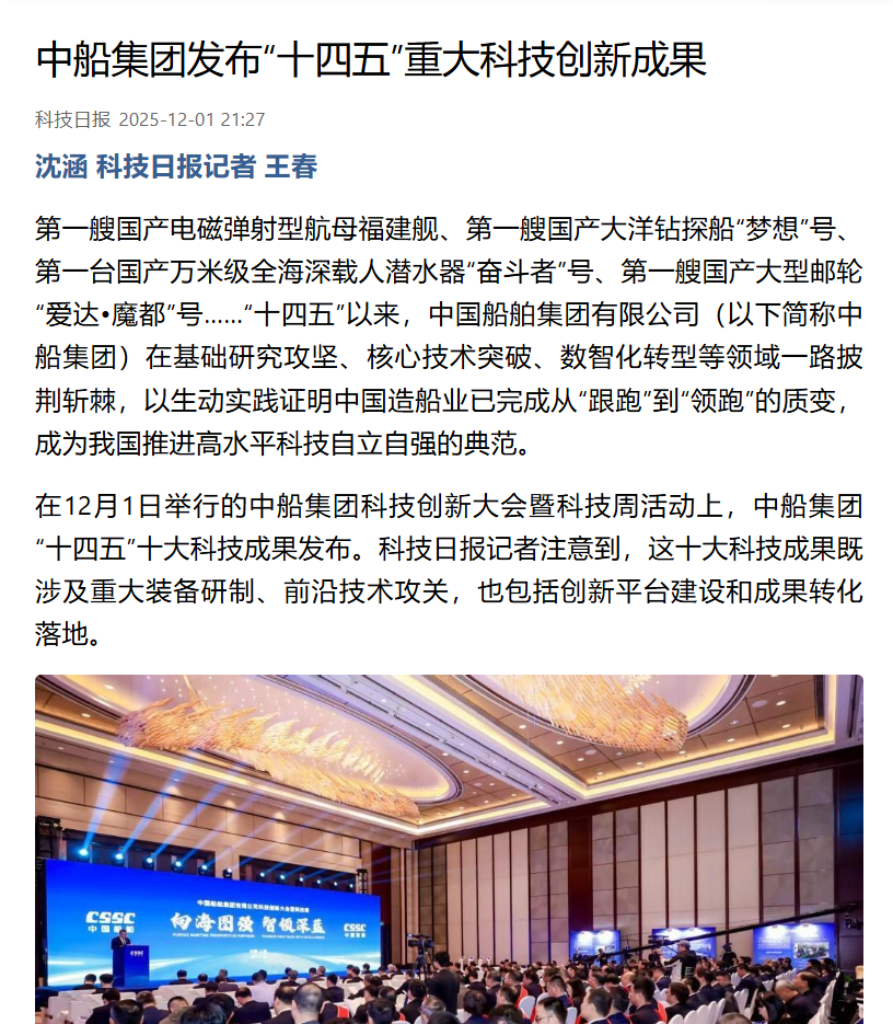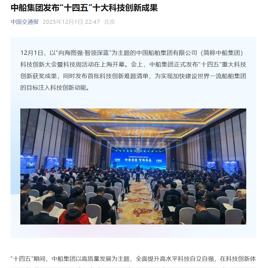 此次大會聚焦“向海圖強·智領深藍”主題,系統總結了中船集團“十四五”期間科技創新工作及重大科技創新成果,謀劃“十五五”科技發展規劃,引發中央、行業及地方媒體的廣泛關注報道。